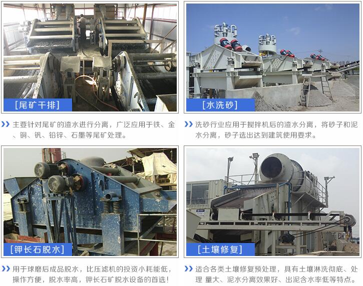 脫水篩廣泛應用于:尾礦干排、細砂回收、水洗砂、煤泥脫水、土壤修復、污水處理等。