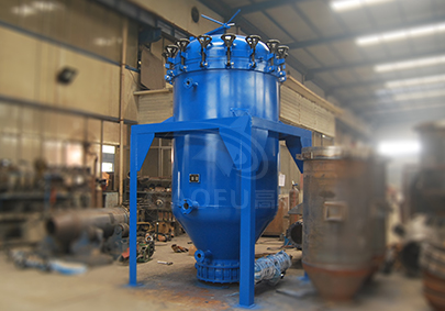 隨著過濾時間的增加,被截留在濾網上的固體雜質越來越多,使濾餅厚度不斷增加,過濾阻力增大,罐內的壓力升高,當壓力升到一定值時需要排渣,停止向罐內輸入待濾液,然后通入蒸汽吹干濾餅。關閉蒸汽,打開蝶閥,啟動振動器,使濾葉振動,將濾網上的濾餅振落經罐體下方排渣口排出。